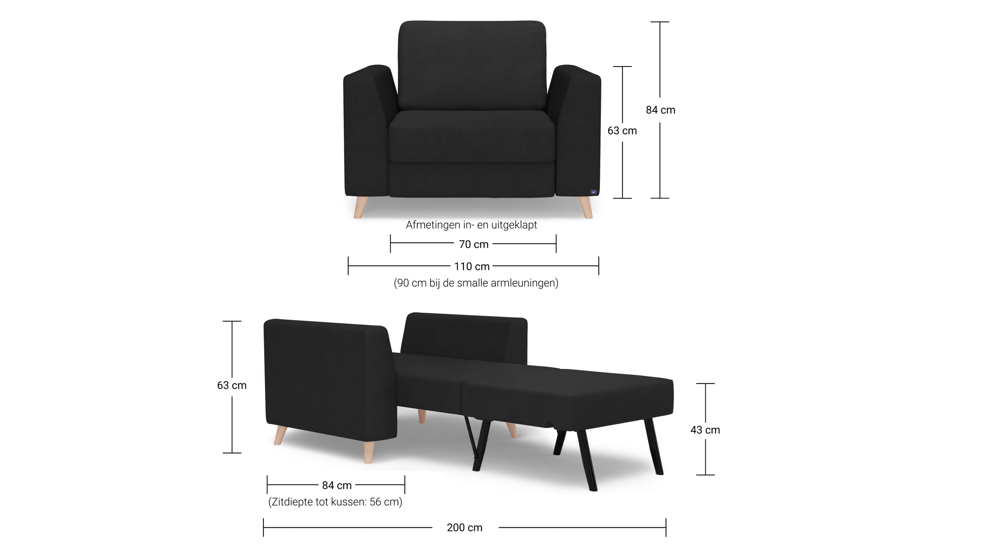 Bruno slaapstoel zowel in opgevouwen als uitgeklapte toestand voor maximaal comfort.