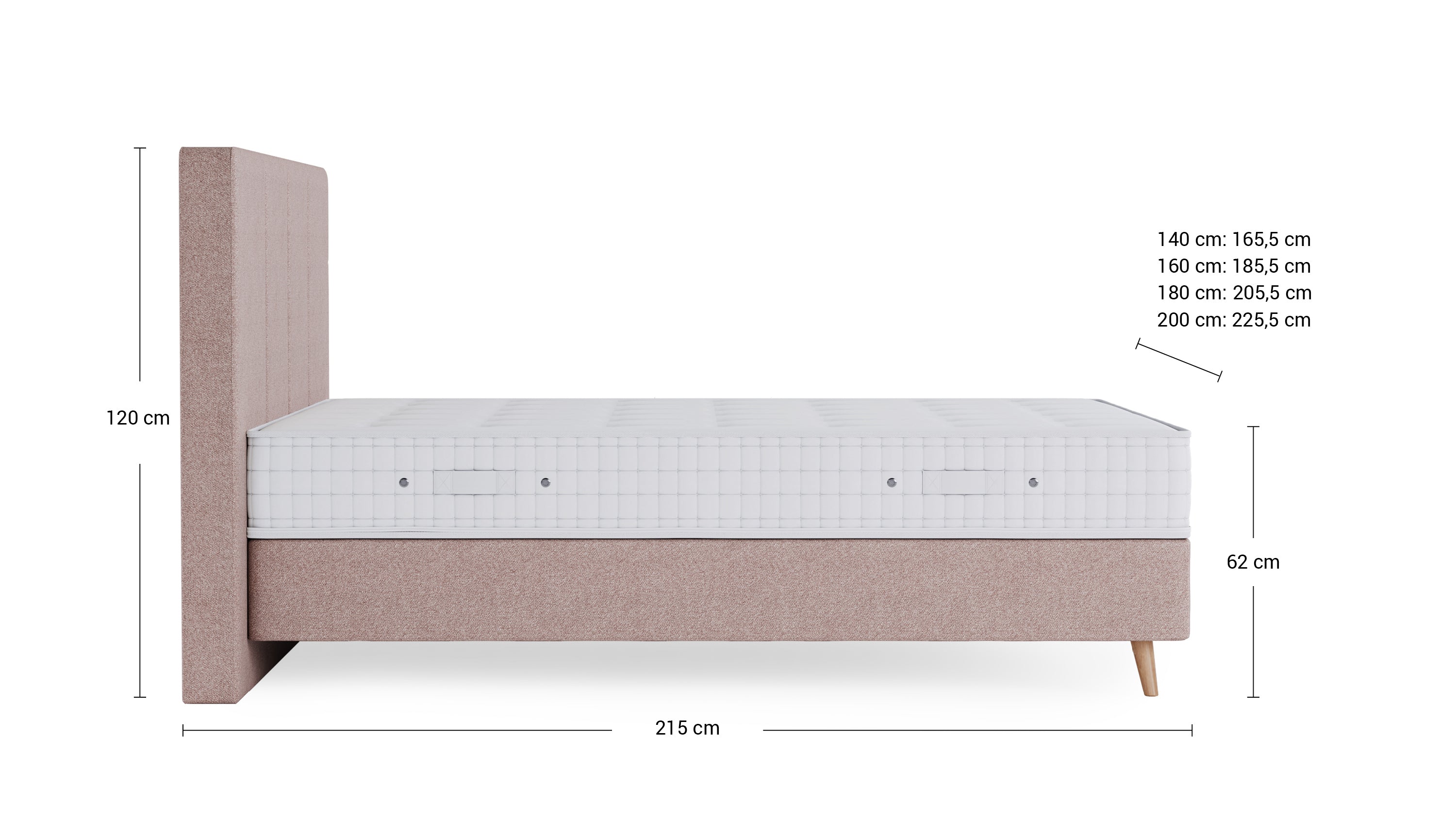 De comfortabele instaphoogte van 62 cm zorgt voor moeiteloos in- en uitstappen, volledig zonder inspanning. Het geeft het bed harmonieuze proporties en maakt het comfort van de Bruno Surpreme boxspring elke dag voelbaar.
